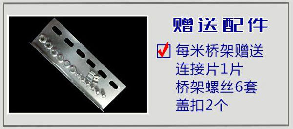 贈送配件,每米槽式橋架贈送連接片1片,橋架螺絲6套,蓋扣2個