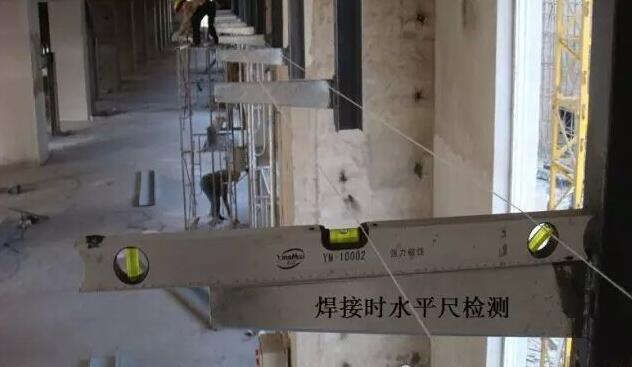 4、根據土建所給標高,確定兩端立柱焊接位置,立柱焊接在墊板上,焊接前使用水平尺進行檢測以保證立柱垂直度。