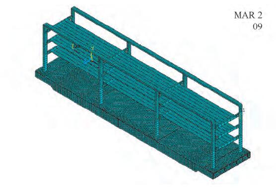 采用ANSYS 建立有限元模型,建模過程中進(jìn)行了適當(dāng)?shù)暮?jiǎn)化處理,電纜橋架模型中托板及底座采用SHELL63 單元,立柱與橫檔采用BEAM4 單元,螺栓采用BEAM188 單元。電纜橋架有限元模型見圖2。