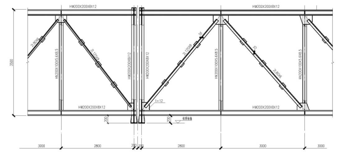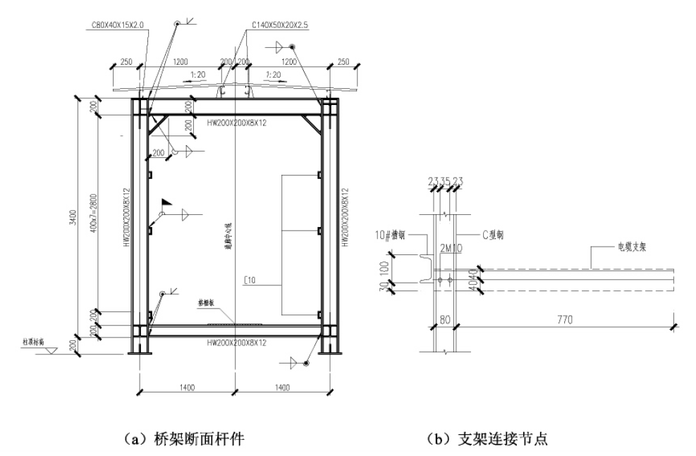 30m 和40m 跨橋架均采用普通鋼結構形式。圖3 為30m 跨橋架斷面結構桿件布置圖, 其上下弦桿件外圍高度為3.4m,考慮到排水及美觀因素,在其頂面用C 型鋼和彩鋼板設置了坡屋頂。在斷面內部的小立柱上布置了3 根通長的10# 槽鋼,用于連接豎向C 型鋼,在C 型鋼上最終連接電纜支架(共7 回),具體如圖3(b)所示。橋架縱向立面如圖4 所示。桁架直接按簡支落在河道兩側的鋼柱上,因此考慮支座處的空間關系,30m 跨2 個端部各留200mm 的距離, 因此30m 桁架在端部的節間長度為2.8m,其余節間長度均為3m,40m 跨和50m 跨度的橋架節間長度同理設置。桁架上弦和下弦每跨均設置了交叉支撐,以保證結構剛度。