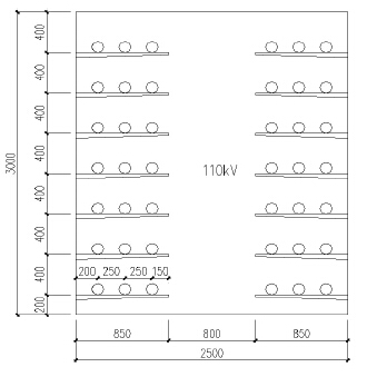 2500mm,電纜支架懸臂長度為850mm,中間檢修通道寬度為800mm。