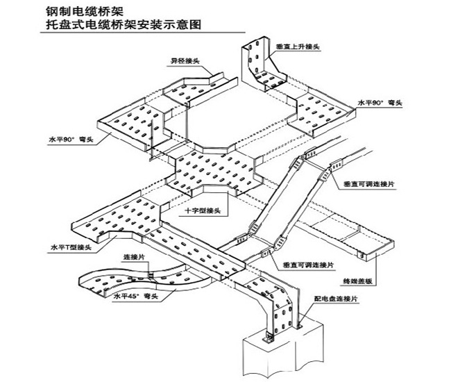 [0003]橋架在敷設路徑上必然會出現分支,以往的施工過程中,出現分支往往通過橋架 向上向下翻彎來避開相鄰橋架,連接方式往往是現場焊接后再涂抹防銹漆,對橋架進行二 次加工,這種方式有以下弊端:若平行敷設的上層或下層敷設有較多管線,不但上下翻彎空 間受限,影響整體管線標高,三根以上橋架平行敷設即無法實現;現場二次加工增加人工材 料等資源浪費;現場二次加工造成施工現場空氣、光污染等,且現場二次加工在電焊作業中 易增加火災隱患。